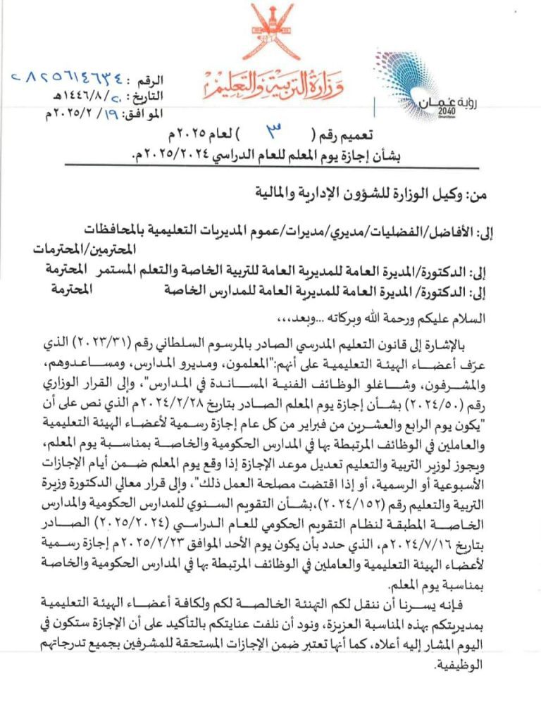 قررت وزارة التربية والتعليم أن يكون يوم الأحد المقبل الموافق 23 فبراير 2025 إجازة للطلاب والهيئة الإدارية والتدريسية في المدارس الحكومية والخاصة في سلطنة عمان بمناسبة يوم المعلم العُماني.