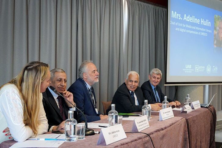 جاء ذلك بحضور سعادة الأستاذ الدكتور /اسماعيل عبد الغفار اسماعيل فرج رئيس الأكاديمية العربية ،الدكتور/ خافيير لافوينتي، رئيس جامعة أوتونما برشلونة، والسيدة/ أدلين هولين، رئيسة وحدة الدراية الإعلامية والمعلوماتية والمهارات الرقمية بمنظمة اليونسكو و نخبة من ممثلي منظمة اليونسكو، وجامعة الدول العربية، ورؤساء الجامعات، والهيئات الإعلامية البارزة.