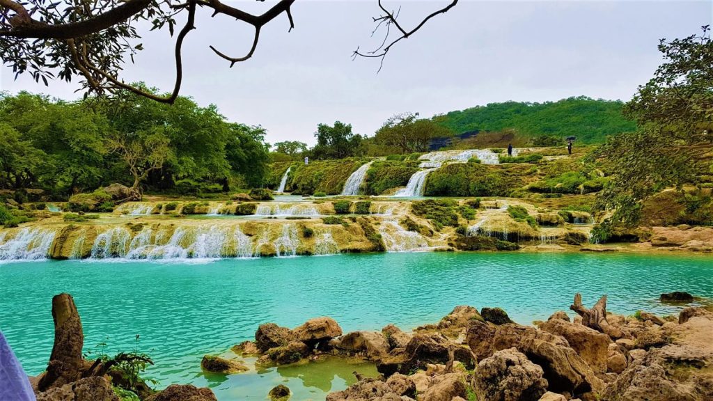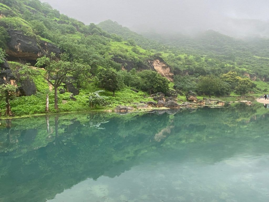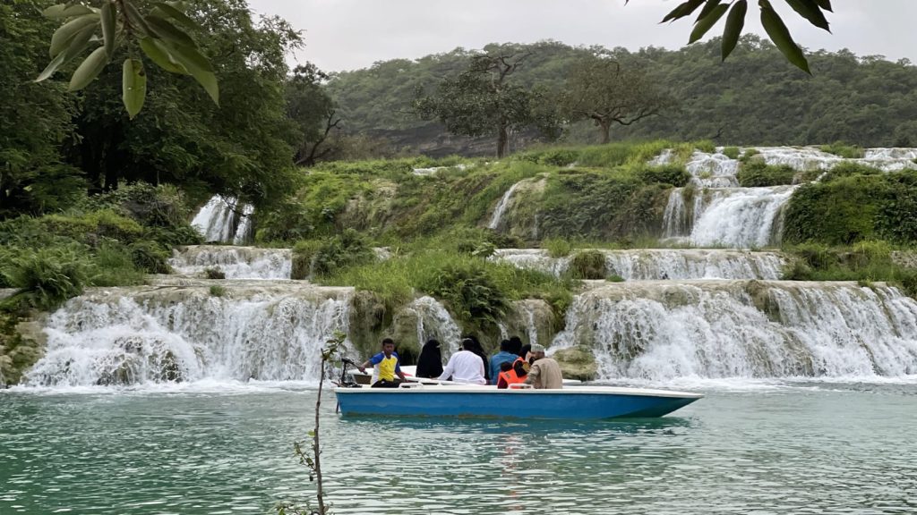 مع حلول الخريف بين شهري يونيو وسبتمبر، تتزين جبال ظفار وسهولها بسجادة خضراء نادرة في منطقة الخليج العربي، وتتدفق الشلالات في عيون مائية مثل عين جرزيز وأثوم وحمران، بينما يلف الضباب قمم الجبال وتزداد برودة الطقس في مشهد بديع يجمع بين المطر المتواصل والأجواء المعتدلة التي تصل درجات الحرارة فيها إلى ما دون 23 درجة مئوية.