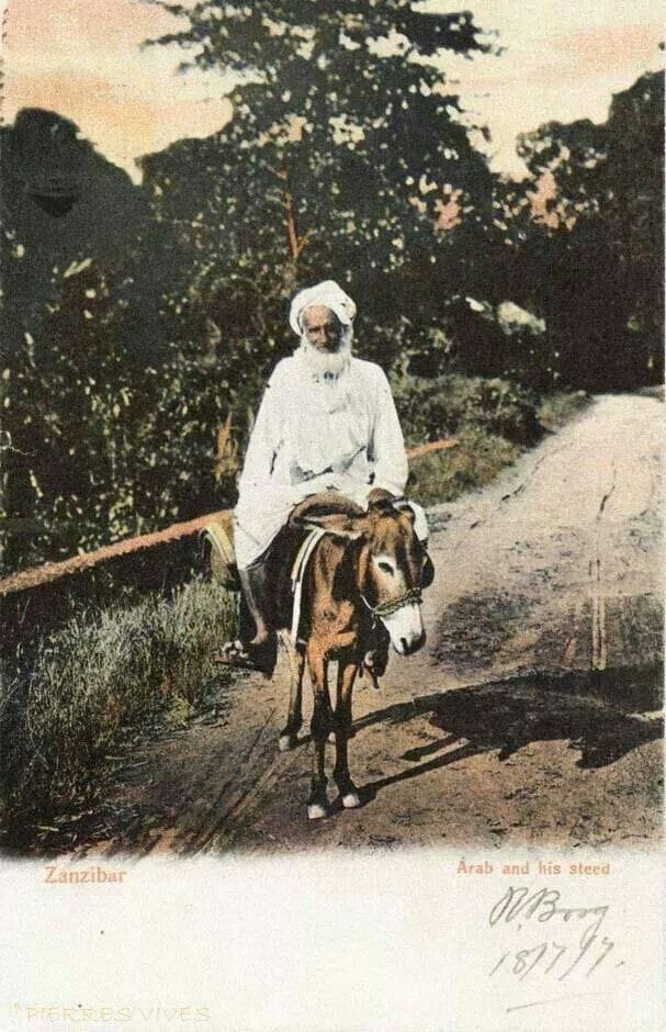 وتظهر إحدى الصور التاريخية، الملتقطة عام 1897م، رجلاً عمانياً مسناً يرتدي الدشداشة العمانية ويحمل خنجراً تقليدياً وهو يمتطي حماره في حديقة بيت المرهوبي، قصر السلطان برغش بن سعيد في زنجبار. ورغم أن الصورة لم تكن ملونة آنذاك، فقد جرى تلوينها حديثاً لتوثيق هذا المشهد التراثي.