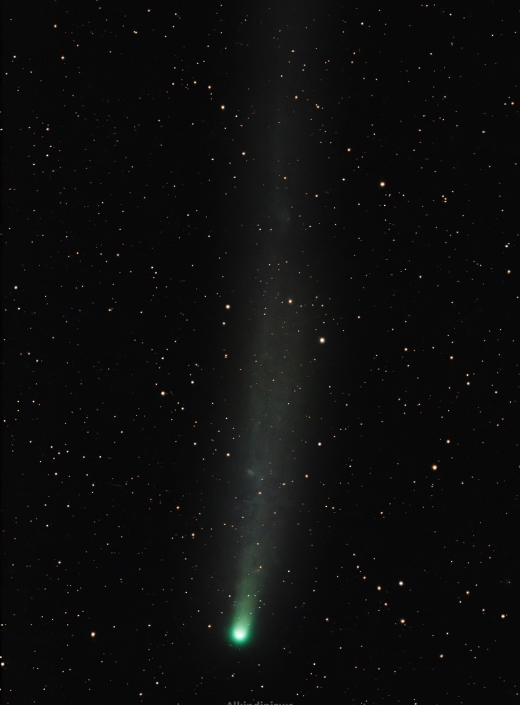 وأشار إلى أن المذنب يُرى من خلال المناظير كنواة مضيئة يتبعها ذيل غازي بلونٍ أخضر، وقد تمكن المصور الفلكي علي بن ربيعة الكندي – عضو الجمعية – من توثيقه من محمية الحجر الغربي لأضواء النجوم، حيث يظهر المذنب بذيلٍ مائل إلى الزرقة ناتج عن تفاعل الغازات المتطايرة من نواته، مثل ثنائي الكربون (C₂) والسيانوجين (CN)، مع الأشعة فوق البنفسجية للشمس، ما يؤدي إلى إصدار توهجٍ أخضر مميز. أما الذيل الممتد فيتكوّن من الغبار والجزيئات التي تدفعها الرياح الشمسية بعيدًا عن الشمس، في مشهد سماوي لافت يمكن مشاهدته من السلطنة خلال هذه الفترة.