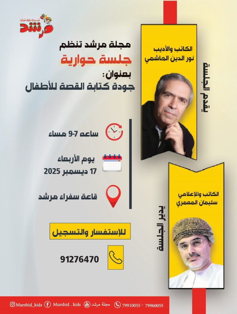 مسقط – تنظم مجلة مرشد جلسة حوارية بعنوان “جودة كتابة القصة للأطفال”، وذلك يوم الأربعاء 17 ديسمبر 2025، من الساعة 7 إلى 9 مساءً، في قاعة سفراء مرشد.