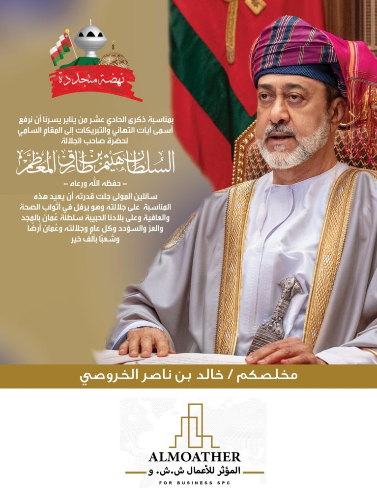 واختتمت شركة المؤثر للأعمال تهنئتها بالدعاء بأن يحفظ الله جلالة السلطان هيثم بن طارق المعظم، ويديم على سلطنة عُمان نعمة الأمن والاستقرار والازدهار.