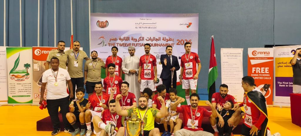 تحت رعاية سعادة الشيخ فيصل بن عبدالله الرواس، رئيس مجلس إدارة غرفة تجارة وصناعة عُمان، اختتمت مساء الخميس 12/2/2026 بصالة مجمع السلطان قابوس الرياضي ببوشر بطولة الجاليات الكروية في نسختها الثانية عشر، تحت شعارها الدائم ( نحبك عُمان). والتي ينظمها نادي الجالية الأردنية بسلطنة عمان.
