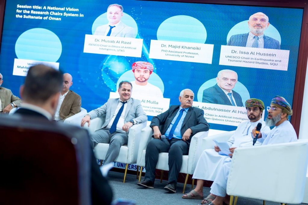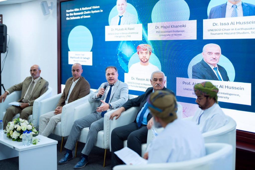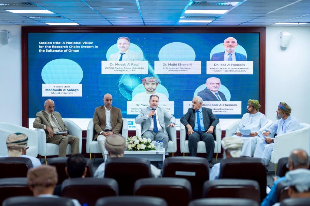وخلال الجلسة، قدم الدكتور مصعب الراوي رؤية استراتيجية حول آليات تطوير منظومة الكراسي البحثية في سلطنة عمان، مؤكداً أهمية بناء شراكات معرفية فاعلة مع القطاع الخاص تقوم على التكامل وتبادل الخبرات وتحقيق أثر تنموي مستدام.