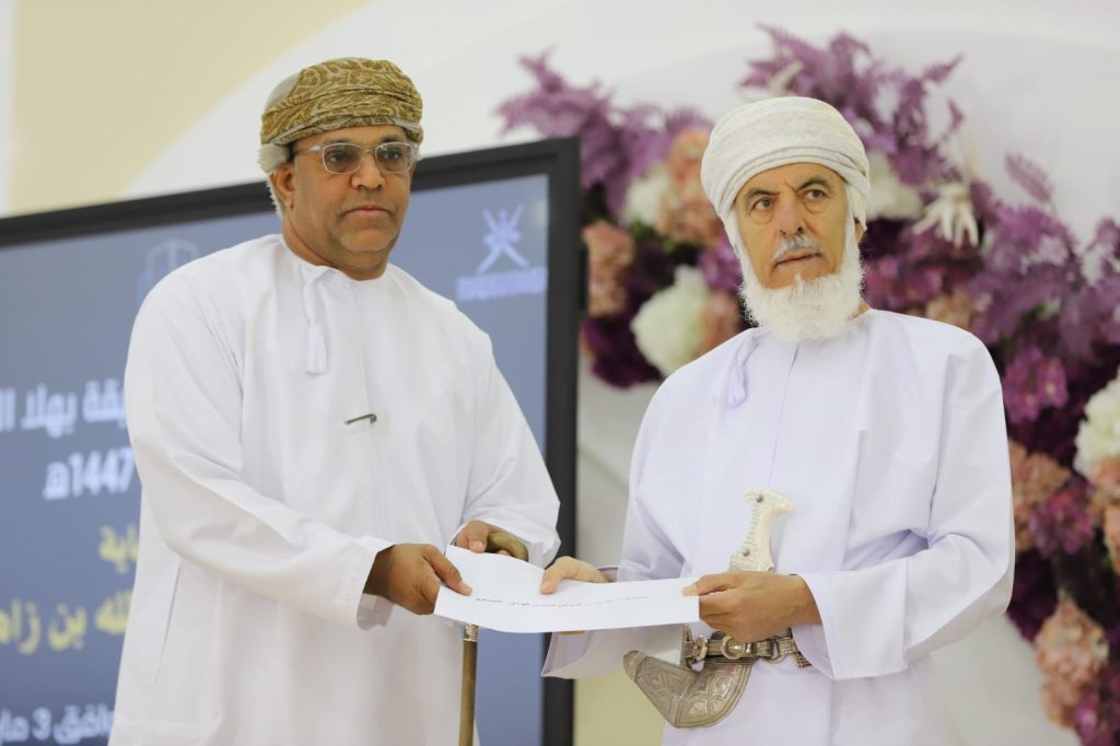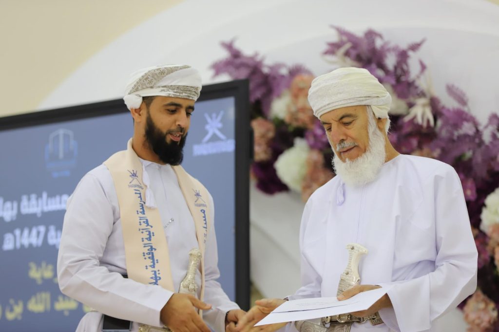 رعى الشيخ محمد بن عبدالله بن زاهر الهنائي حفل المدرسة القرآنية الوقفية بولاية بهلاء لتكريم الفائزين في النسخة الثانية من مسابقة بهلاء القرآنية لعام 1447هـ، التي أقيمت بتنظيم المدرسة القرآنية الوقفية ببهلاء وفريق بهلاء التطوعي بالتعاون مكتب الأوقاف والشؤون الدينية ببهلاء، وذلك بحضور سعادة الشيخ سعيد بن علي بن أحمد النعيمي والي بهلاء، وسعادة الشيخ عمر بن علي الجنيبي عضو مجلس الشورى ممثل ولاية بهلاء، وعبدالرحمن بن سعيد العبري مدير مكتب الأوقاف والشؤون الدينية ببهلاء، وأعضاء المجلس البلدي، وجمع من الشيوخ والرشداء والمسؤولين وأولياء أمور حفظة كتاب الله. وأقيمت الاحتفالية في قاعة إستراحة أبو جيفر بمنطقة حي السعد ببهلاء.