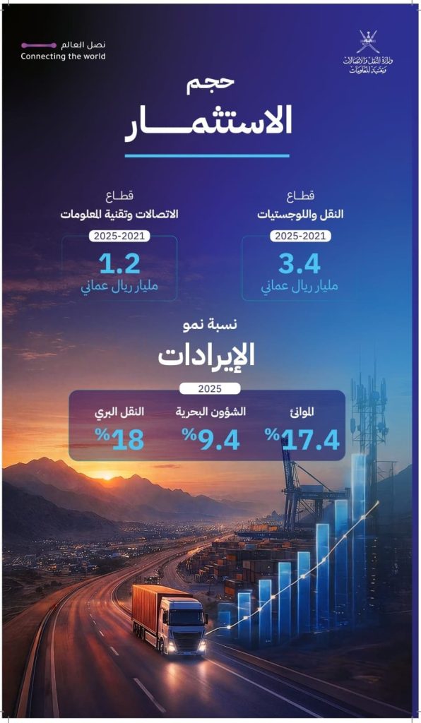 كشفت وزارة النقل والاتصالات وتقنية المعلومات عن بيانات إحصائية تعكس حجم الاستثمار والنمو في قطاعاتها الحيوية، حيث سجل حجم الاستثمار في قطاع النقل واللوجستيات نحو 3.4 مليار ريال عماني خلال الفترة من 2021 إلى 2025، بينما بلغ حجم الاستثمار في قطاع الاتصالات وتقنية المعلومات 1.2 مليار ريال عماني للفترة ذاتها.