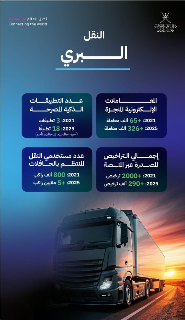 كشفت وزارة النقل والاتصالات وتقنية المعلومات عن مؤشرات إحصائية تعكس التطور المتسارع في قطاع النقل البري، مسجلةً نمواً استثنائياً في التحول الرقمي والإقبال الجماهيري على خدمات النقل المنظم بين عامي 2021 و2025.