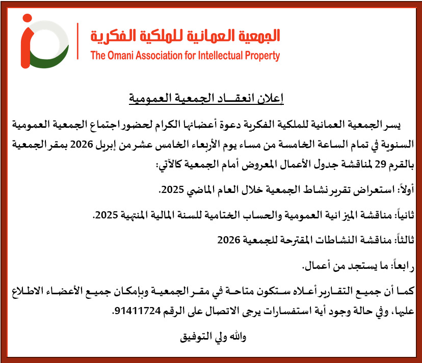 أعلنت الجمعية العمانية للملكية الفكرية عن دعوة أعضائها لحضور اجتماع الجمعية العمومية السنوي، والمقرر عقده في تمام الساعة الخامسة من مساء يوم الأربعاء، الموافق 15 أبريل 2026.
