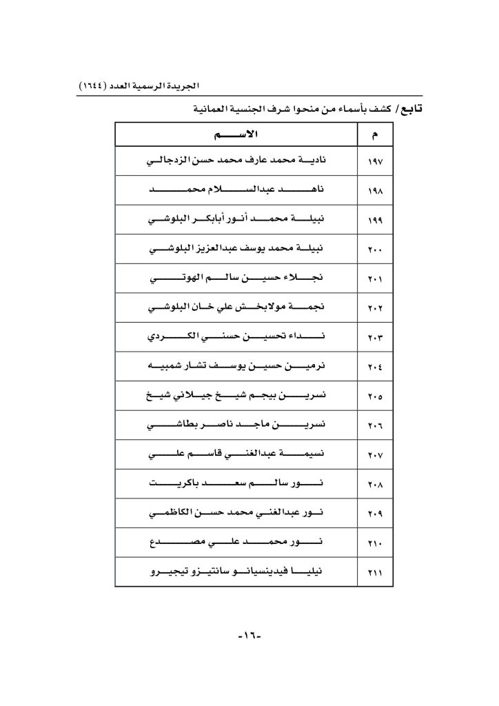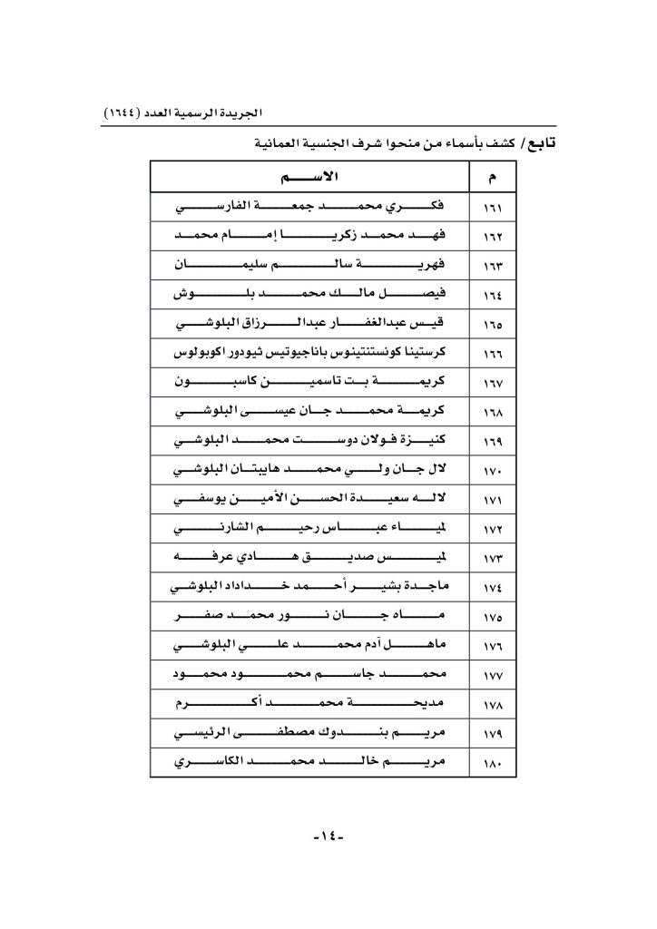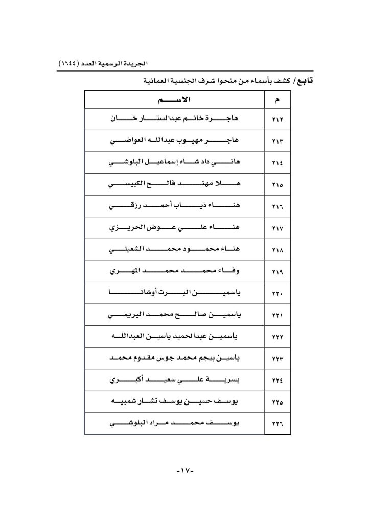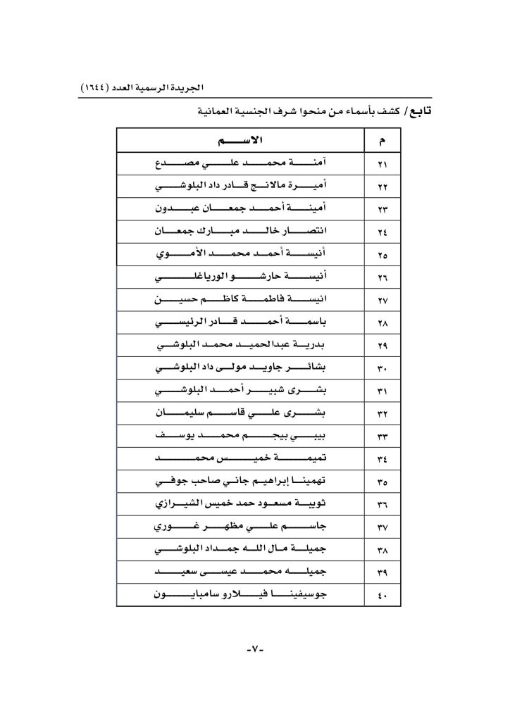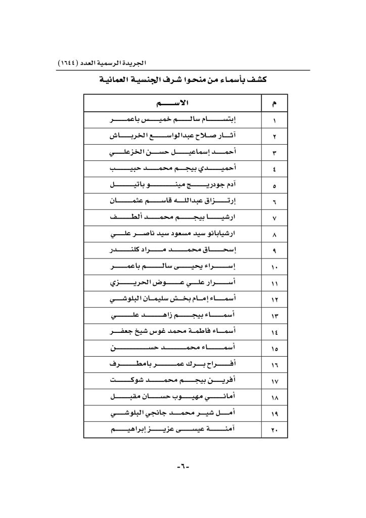 وبحسب المادة الأولى، تمنح الجنسية العُمانية لكل من الواردة أسمائهم في القائمة المرفقة.