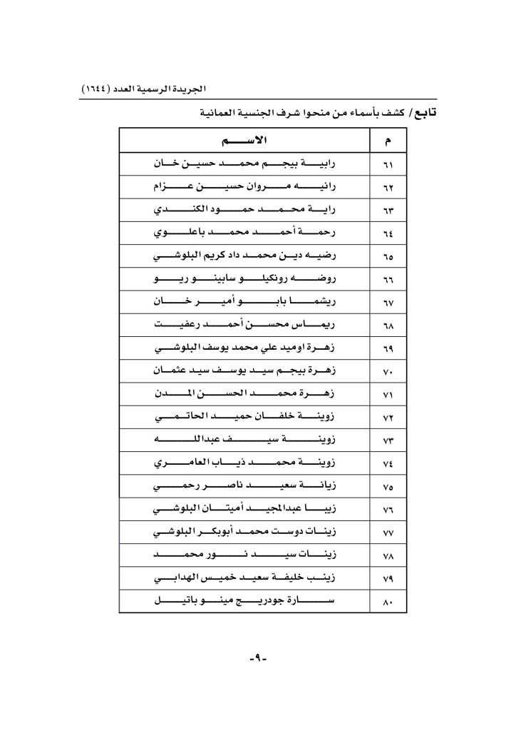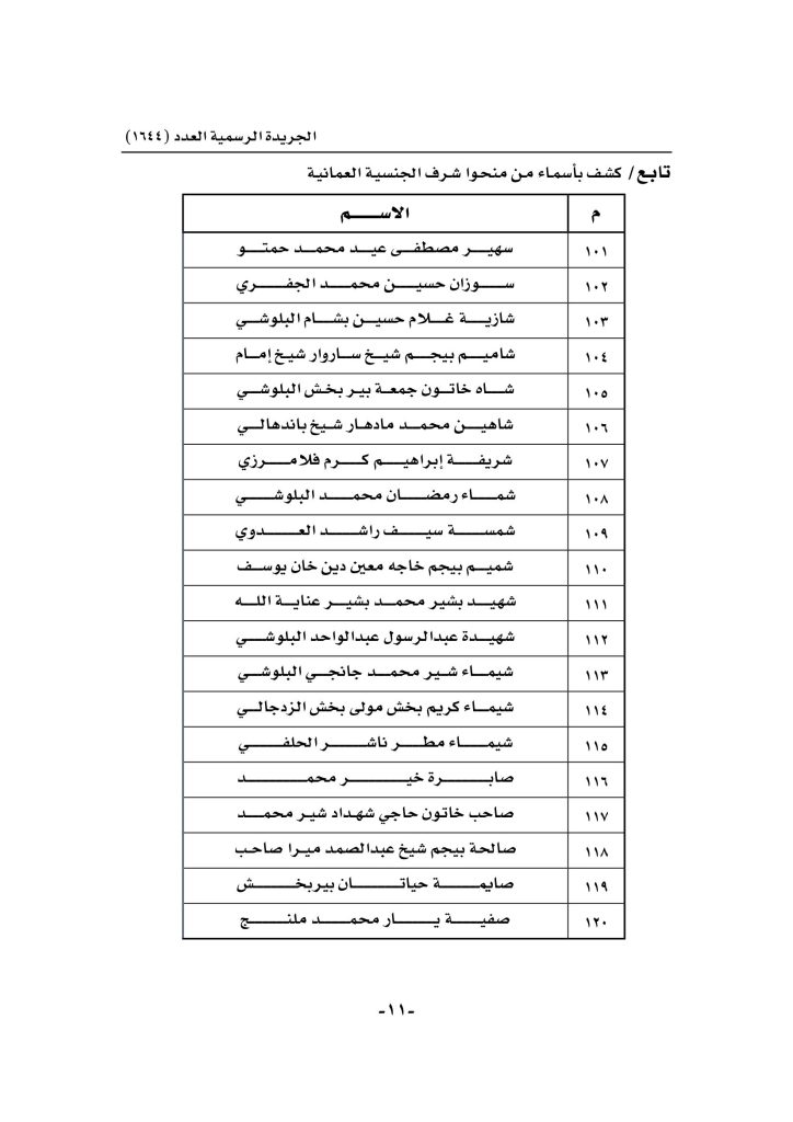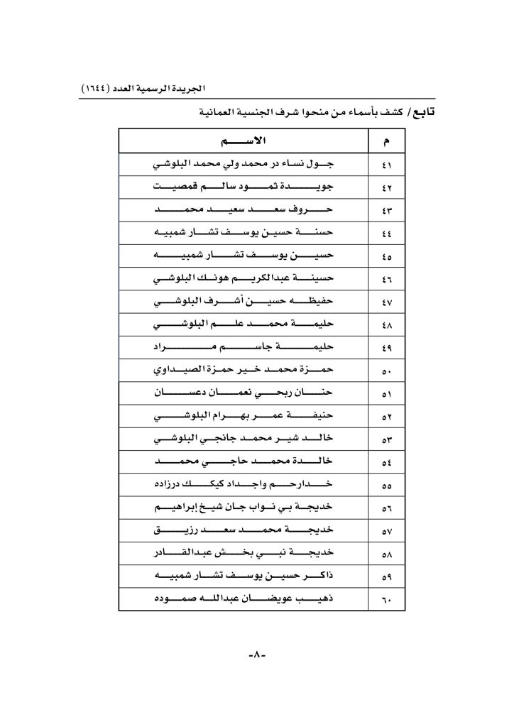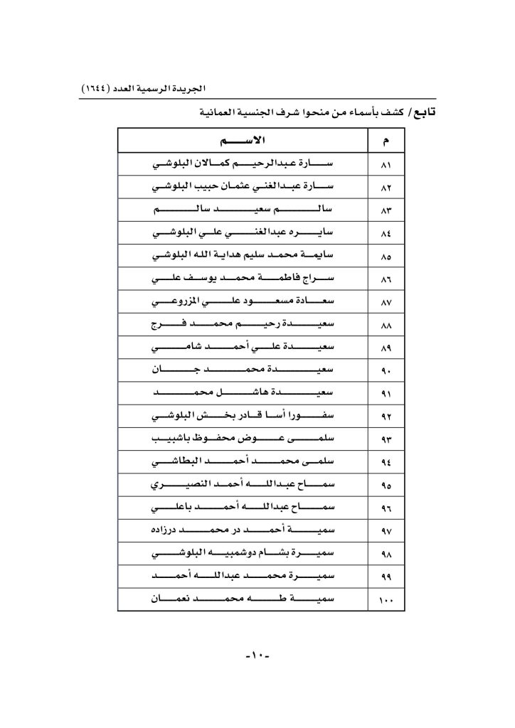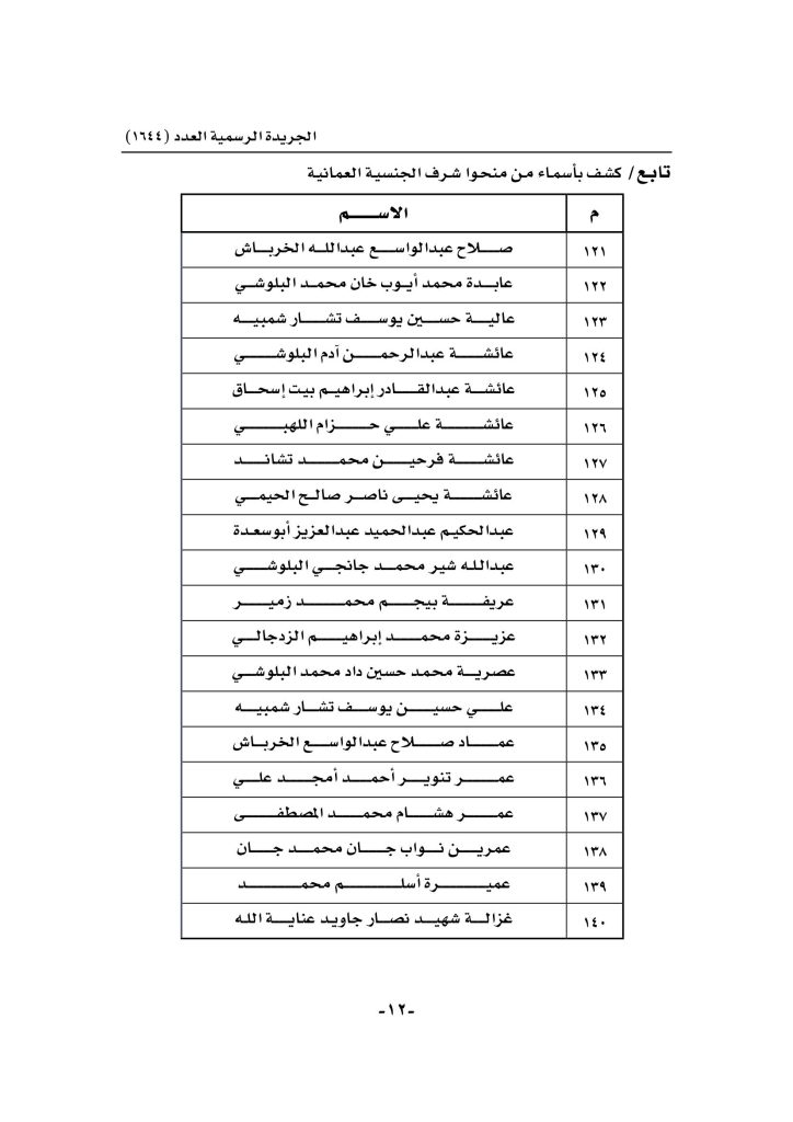 وبحسب المادة الأولى، تمنح الجنسية العُمانية لكل من الواردة أسمائهم في القائمة المرفقة.