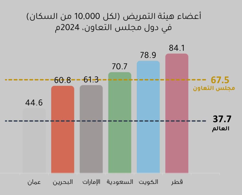 وعلى مستوى كثافة الكوادر التّمريضية بالنسبة لعدد السكان، بلغ متوسط عدد أعضاء هيئة التمريض في دول مجلس التعاون 67.5 ممرض لكل 10 آلاف نسمة في عام 2024، وهو معدل يفوق المتوسط العالمي البالغ 37.7 ممرض لكل 10 آلاف نسمة